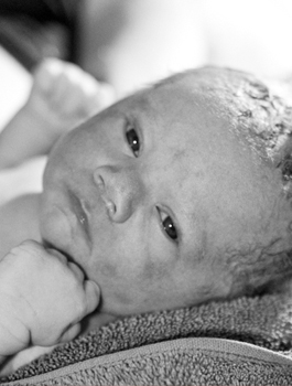 She labored in the family room for awhile and then moved to their spacious master bedroom where she had set up a birthing station (being a midwife, she was prepared!) with a birth stool (low chair) and waterproofing around it.